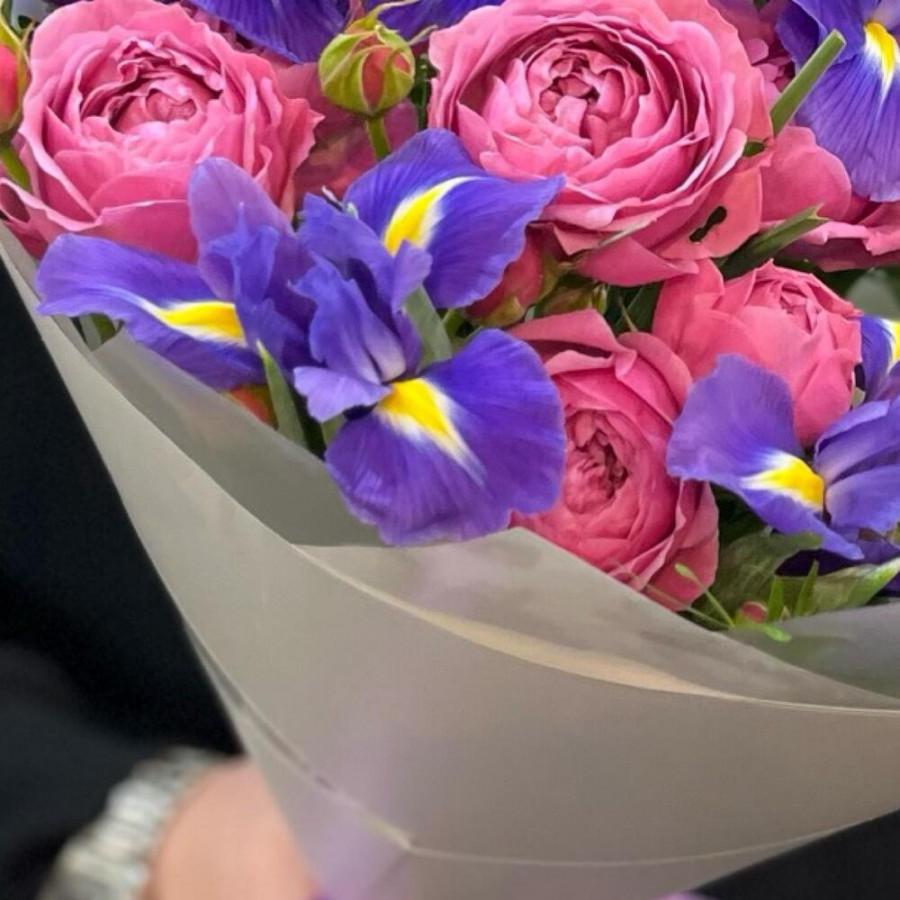 На фото букет из розовых пионовидных роз и синих ирисов. В составе: кустовая пионовидная роза 3 шт, ирис 7 шт, писташ 5 шт, дизайнерская упаковка 1 шт, атласная лента 1 шт, . Все цветы свежие и ароматные, букет красиво оформлен и отлично подходит для подарка. Доступна доставка цветов или самовывоз.