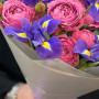 Букет из розовых пионовидных роз и синих ирисов в Суровикино